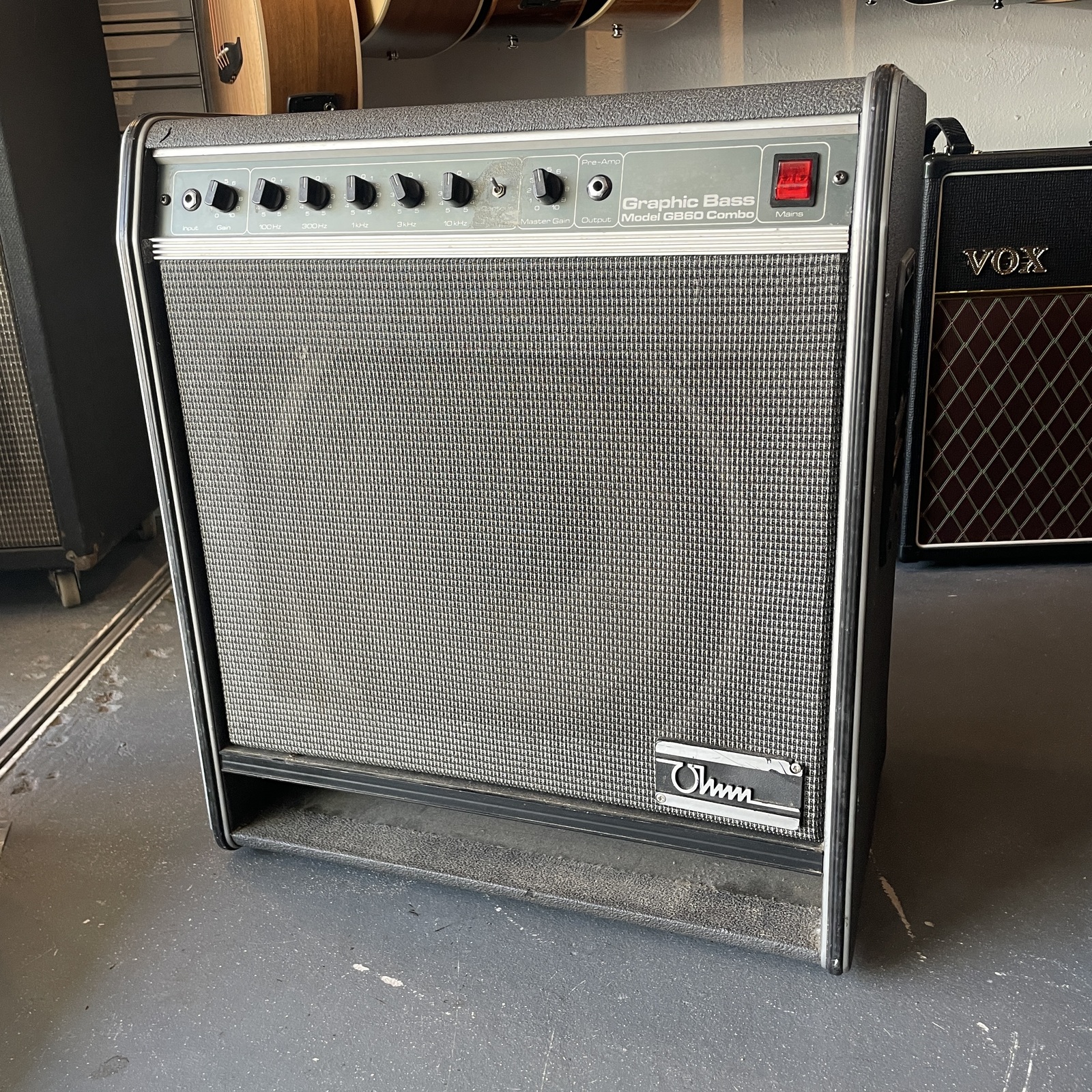 Ohm UK GB60 Graphic Bass 115 Bass Combo. Very little info about this company, but they were a British outfit in the 80s and 90s that made bass and guitar amps in the UK. This is a 60W 115 combo with a 5 band EQ and contour switch that can go from stock clean, to actually grinding pretty hard when you ride the gain control. This would make a great secret weapon amp for recording or for practicing at home with a little extra 'oomph'. For its age it's in great condition and works as it should.